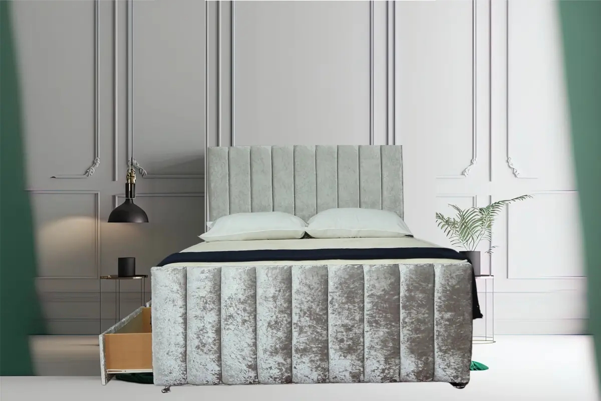 Dreamy Nights Silver Crushed Velvet 4ft6 Storage Divan Bed with Headboard